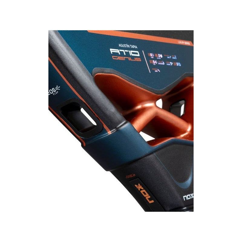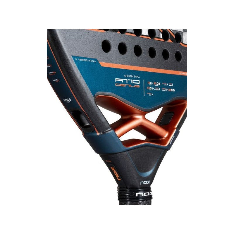 La Nox AT10 Genius Attack 18K Alum By Agustín Tapia 2025 es una paleta de pádel de alta gama creada para los jugadores más exigentes. Diseñada junto al profesional Agustín Tapia y perteneciente a la prestigiosa Luxury Series 2025, esta paleta destaca tanto por su rendimiento como por su diseño exclusivo en tonos negro, azul y bronce. Gracias a su formato diamante y los planos en carbono 18K Alum, está diseñada para maximizar la potencia sin perder control en el juego.